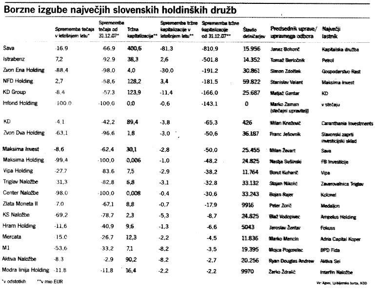 Včeraj so bili vsi borzni holdingi, ki obvladujejo velik del slovenskega gospodarstva, vredni le še 1,02 milijarde evrov. To je celo 200 milijonov evrov manj, kot je bila konec leta 2007 vredna samo Sava. Maksimo Holding in Center Naložbe, ki sta bila na svojem vrhuncu skupaj vredna okoli 80 milijonov evrov, bi včeraj vlagatelj lahko kupil že za vsega 14.000 evrov, vso vrednost pa je izgubil Infond Holding, ki je končal v stečaju. Stečaj grozi tudi Centru Naložbam in Maksimi Holding, Zvon Ena Holding pa je zaradi neporavnave svojih obveznosti in blokade računov tik pred prostovoljno poravnavo.