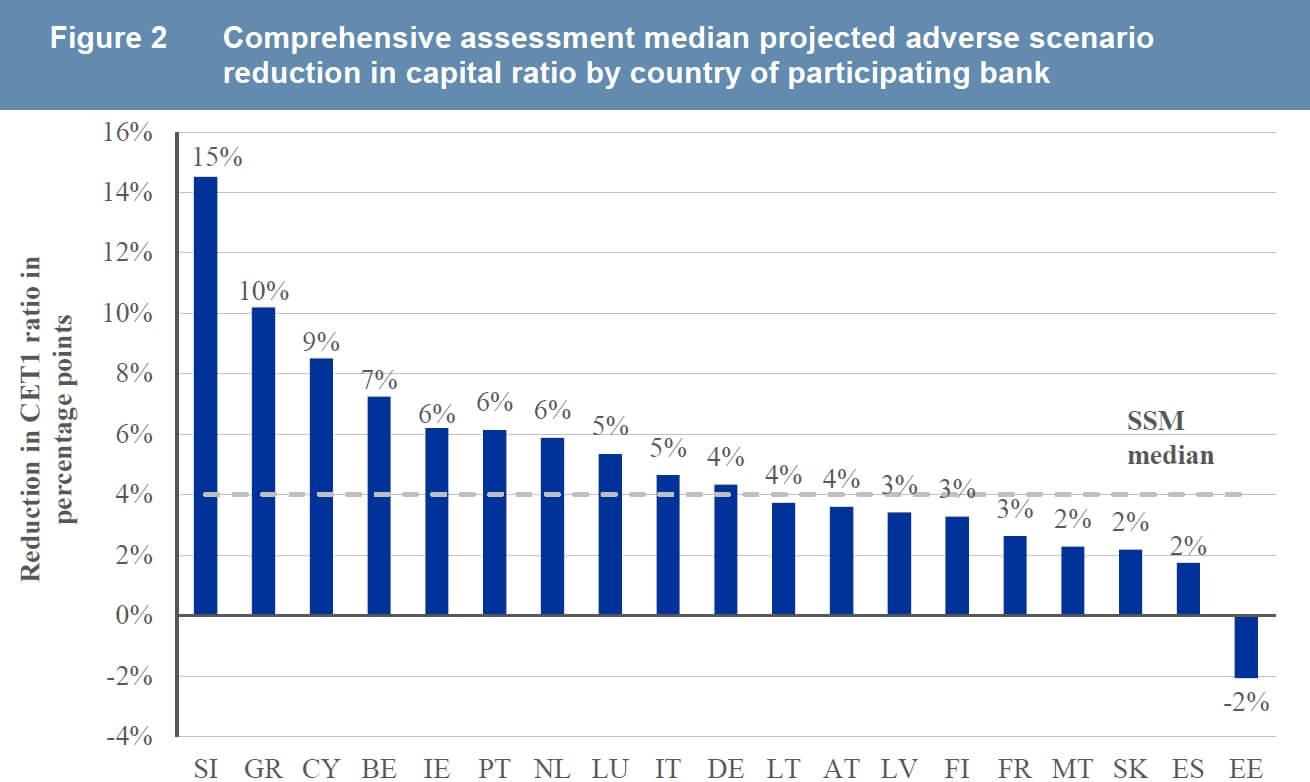 Številk, ki bi to potrjevale, dr. Masten ni navedel, že v času, ko je svoje trditve zapisal, pa je bilo tudi dokaj jasno, zakaj. Že drugi grafikon v poročilu o rezultatih obremenitvenih testov namreč pove, da bi se po negativnem scenariju teh testov, ki je bil specifičen za vsako državo, kapitalska ustreznost bank do konca prihodnjega leta daleč najbolj poslabšala prav v Sloveniji: za 15 odstotnih točk, druga najslabša je Grčija z 10, tretji pa Ciper z 9 odstotnimi točkami poslabšanja.